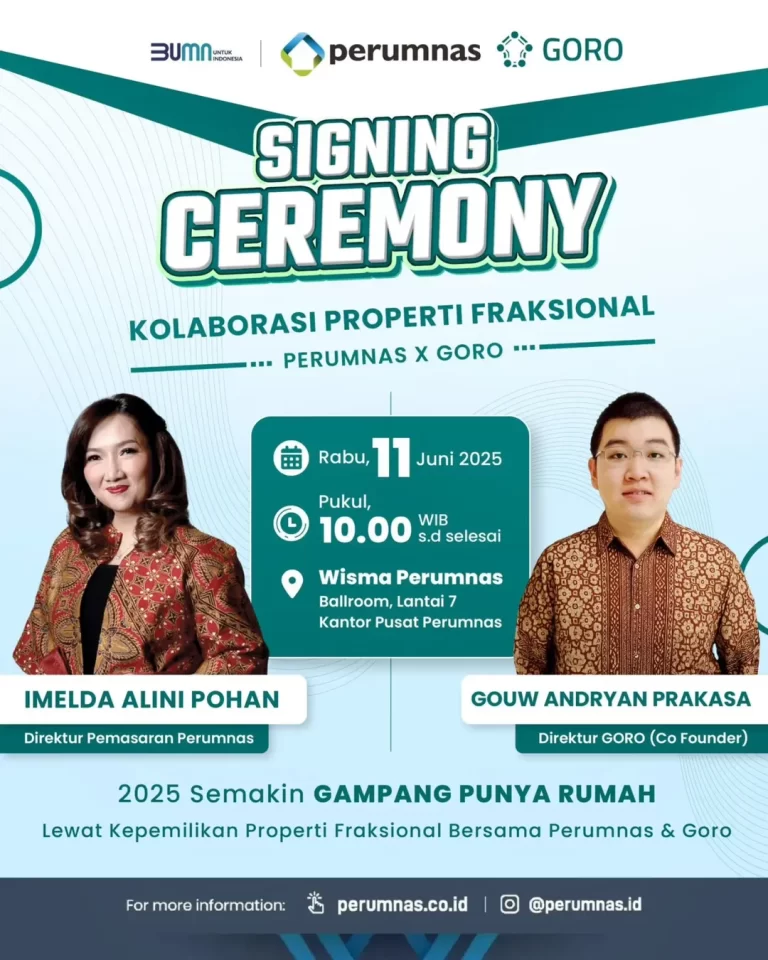 Perumnas & PT. Gotong Royong Properti (Goro) akan melakukan kolaborasi pemasaran & penjualan properti secara fraksional. Signing Ceremony yang dilakukan oleh Perumnas & Goro akan menjadi titik awal inovasi akses kepemilikan hunian yang lebih fleksibel & terjangkau melalui sistem kepemilikan fraksional.