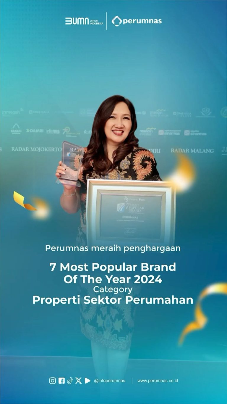 Perum Perumnas menerima penghargaan pada ajang Jawa Pos 7 Most Popular Brand of The Year untuk Kategori Properti Sektor Perumahan. Penghargaan diterima oleh Direktur Pemasaran Perumnas, Ibu Imelda Alini Pohan di Gedung Raffles Balai Kartini Jakarta, pada 3 September 2024